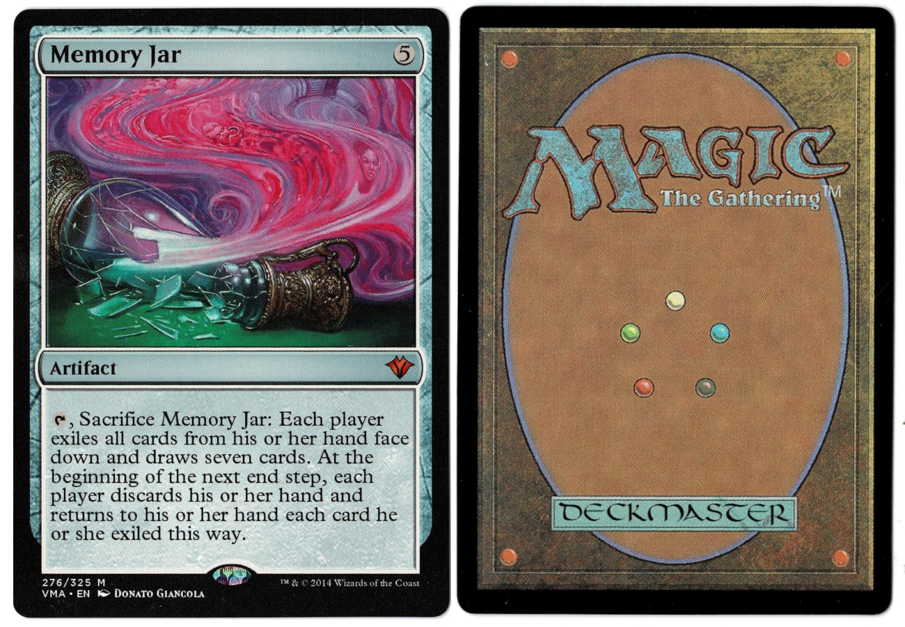 tap, Sacrifice Memory Jar: Each player sets aside his or her hand, face down, and draws seven cards. At end of turn, each player discards his or her hand and returns to his or her hand each card he or she set aside this way.