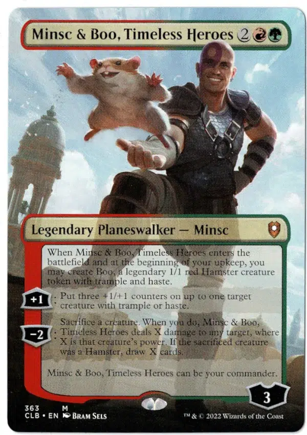 [-2]: Sacrifice a creature. When you do, Minsc & Boo, Timeless Heroes deals X damage to any target, where X is that creature’s power. If the sacrificed creature was a Hamster, draw X cards.