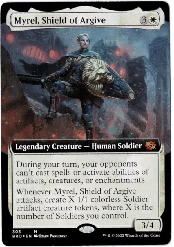 Whenever Myrel, Shield of Argive attacks, create X 1/1 colorless Soldier artifact creature tokens, where X is the number of Soldiers you control.