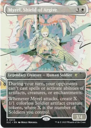 Whenever Myrel, Shield of Argive attacks, create X 1/1 colorless Soldier artifact creature tokens, where X is the number of Soldiers you control.