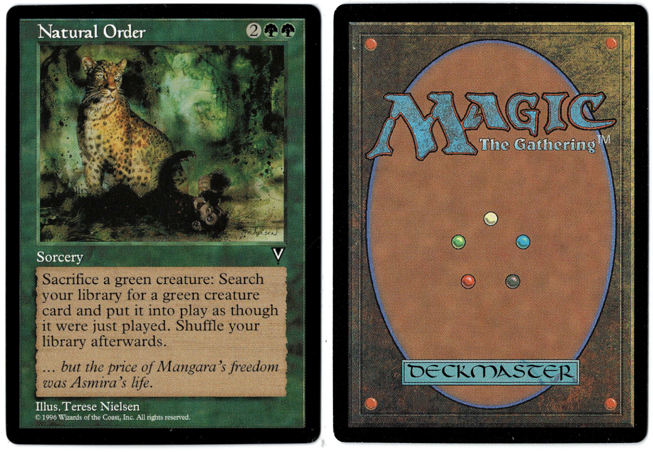 Sacrifice a green creature: Search your library for a green creature card and put it into play as though it were just played. Shuffle your library afterwards.