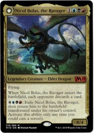 4UBR: Exile Nicol Bolas, the Ravager, then return him to the battlefield transformed under his owner’s control. Activate this ability only any time you could cast a sorcery.Nicol Bolas, the Arisen [7][+2]: Draw two cards.