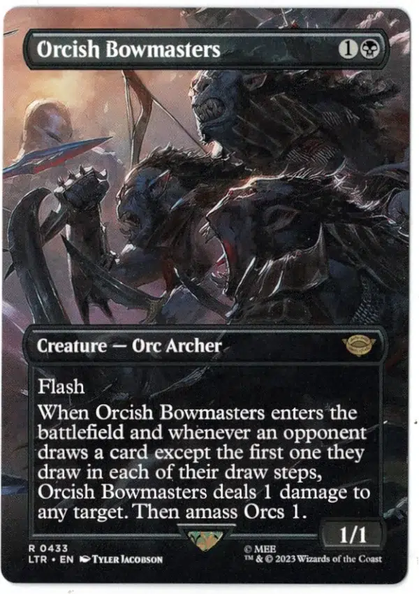 When Orcish Bowmasters enters the battlefield and whenever an opponent draws a card except the first one they draw in each of their draw steps, Orcish Bowmasters deals 1 damage to any target. Then amass Orcs 1.