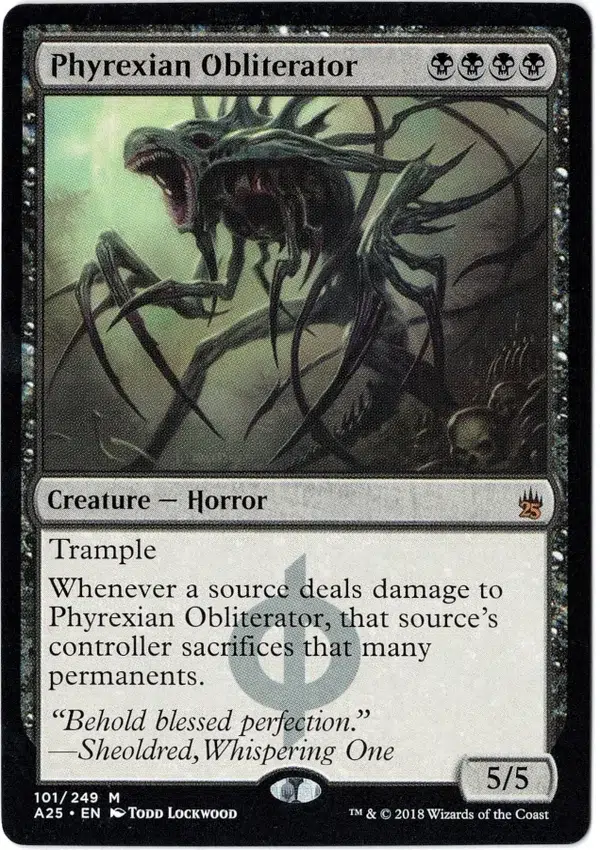 Whenever a source deals damage to Phyrexian Obliterator, that source’s controller sacrifices that many permanents.