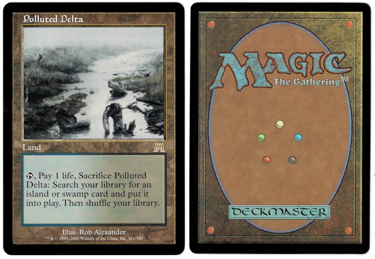 T, Pay 1 life, Sacrifice Polluted Delta: Search your library for an island or swamp card and put it into play. Then shuffle your library.