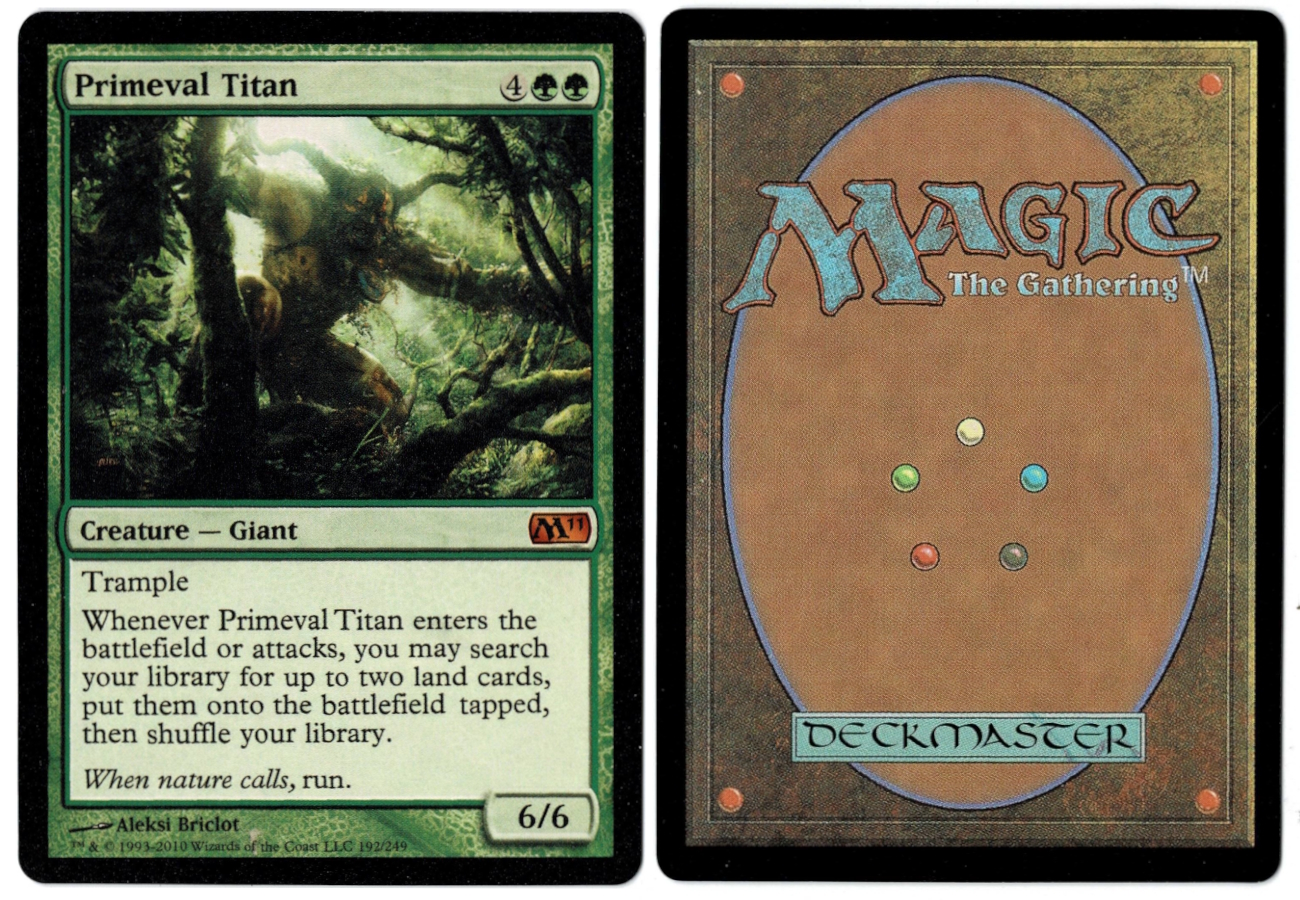 Whenever Primeval Titan enters the battlefield or attacks, you may search your library for up to two land cards, put them onto the battlefield tapped, then shuffle your library.
