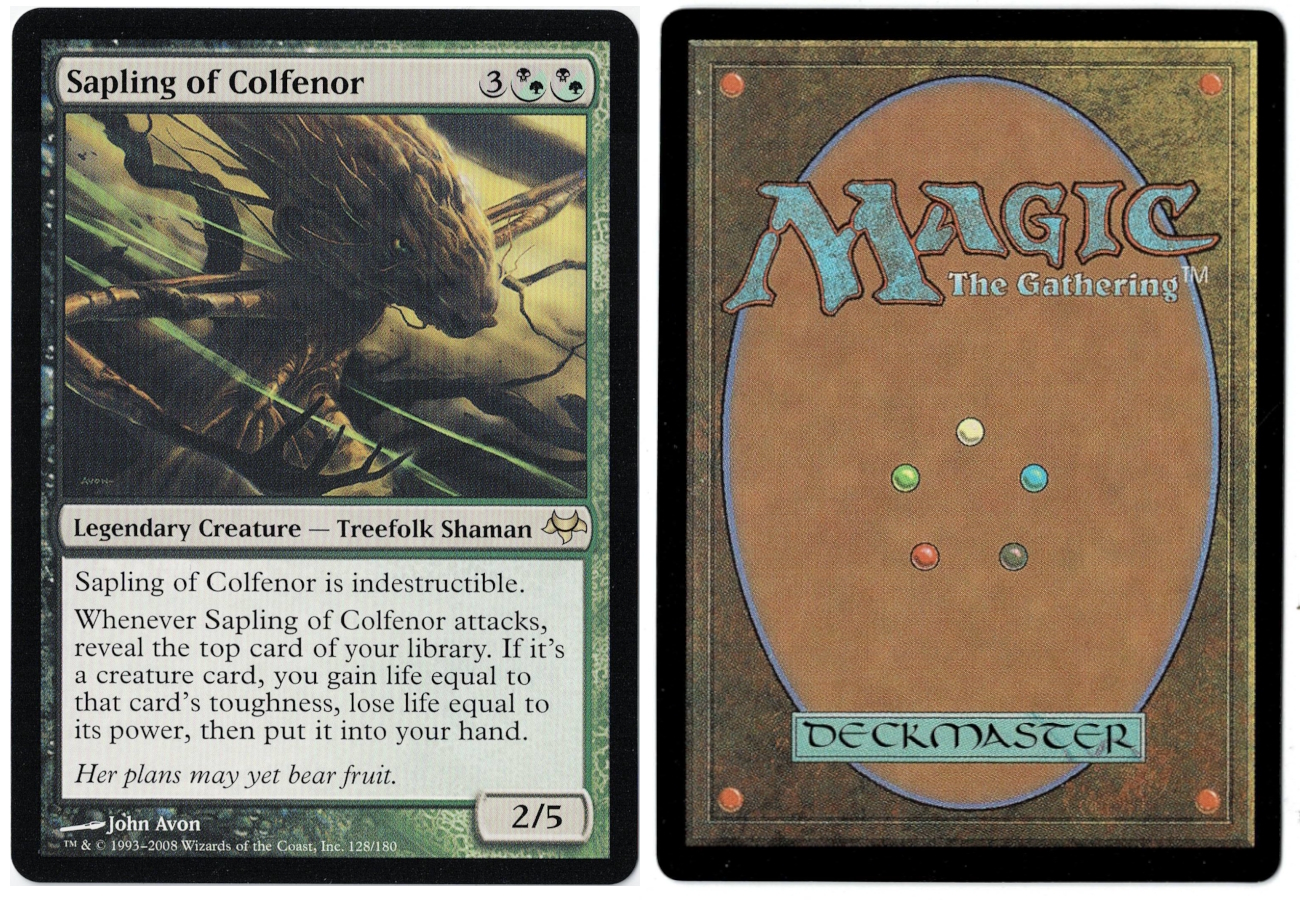 Whenever Sapling of Colfenor attacks, reveal the top card of your library. If it’s a creature card, you gain life equal to that card’s toughness, lose life equal to its power, then put it into your hand.