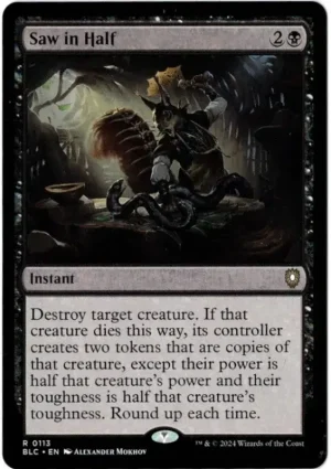 Destroy target creature. If that creature dies this way, its controller creates two tokens that are copies of that creature, except their base power is half that creature’s power and their base toughness in half that creature’s toughness. Round up each time.