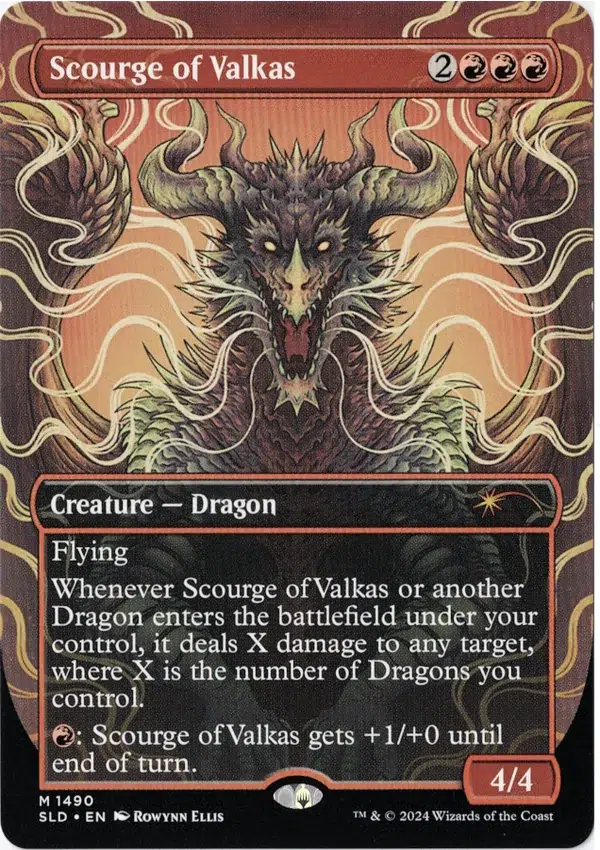 Whenever Scourge of Valkas or another Dragon enters the battlefield under your control, it deals X damage to any target, where X is the number of Dragons you control.
