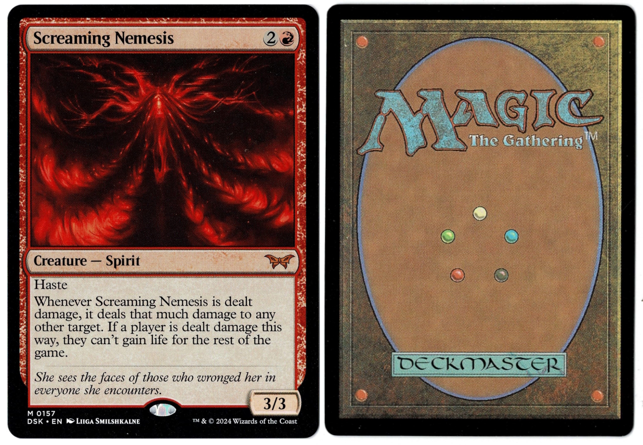 Whenever Screaming Nemesis is dealt damage, it deals that much damage to any other target. If a player is dealt damage this way, they can’t gain life for the rest of the game.