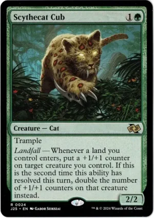 Landfall — Whenever a land you control enters, put a +1/+1 counter on target creature you control. If this is the second time this ability has resolved this turn, double the number of +1/+1 counters on that creature instead.