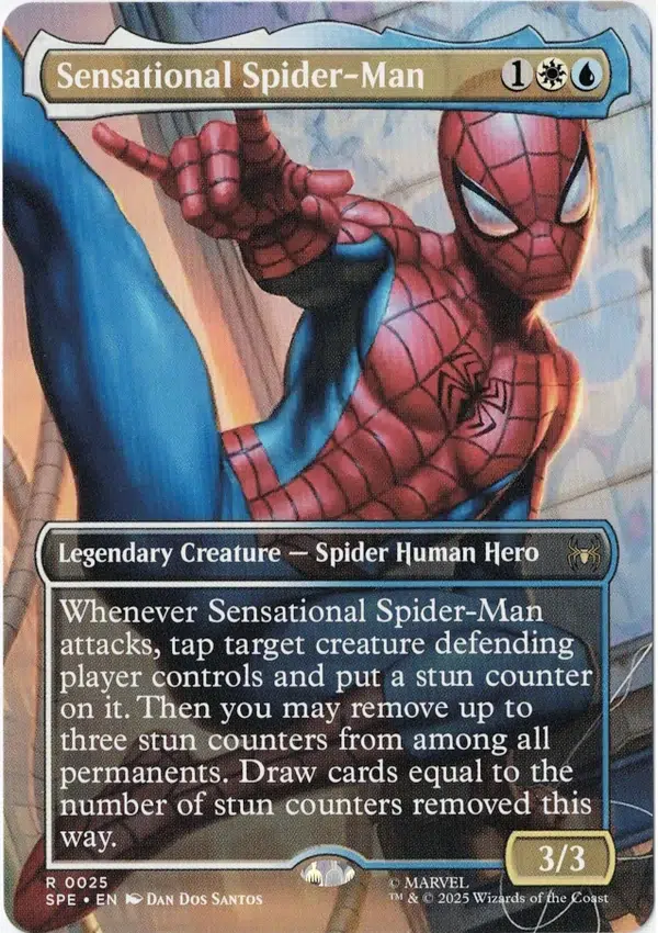 Whenever Sensational Spider-man attacks, tap target creature defending player controls and put a stun counter on it. Then you may remove up to three stun counters from among all permanents. Draw cards equal to the number of stun counters removed this way.