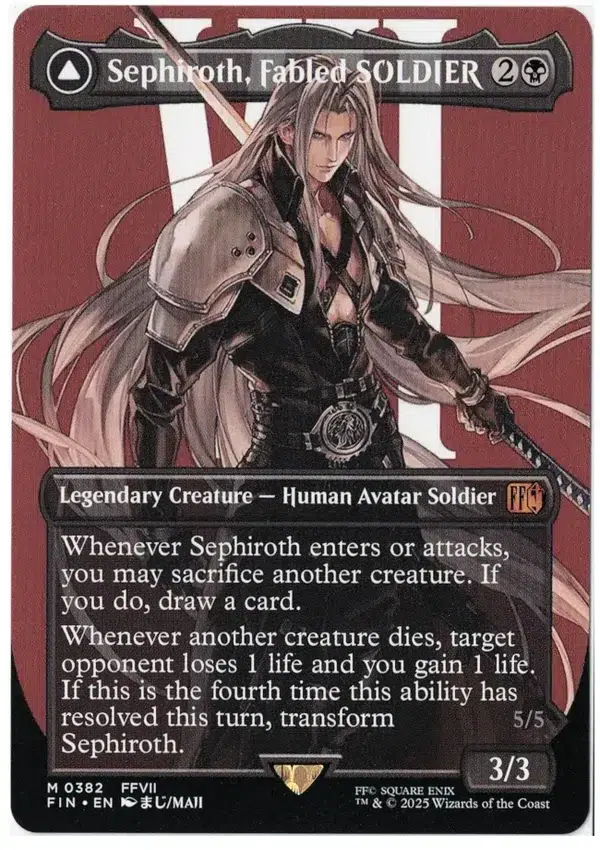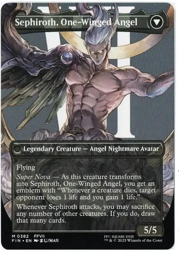 Super Nova — As this creature transforms into Sephiroth, One-Winged Angel, you get an emblem with “Whenever a creature dies, target opponent loses 1 life and you gain 1 life.”