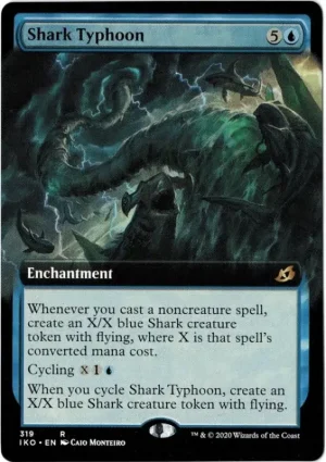 Whenever you cast a noncreature spell, create an X/X blue Shark creature token with flying, where X is that spell’s converted mana cost.