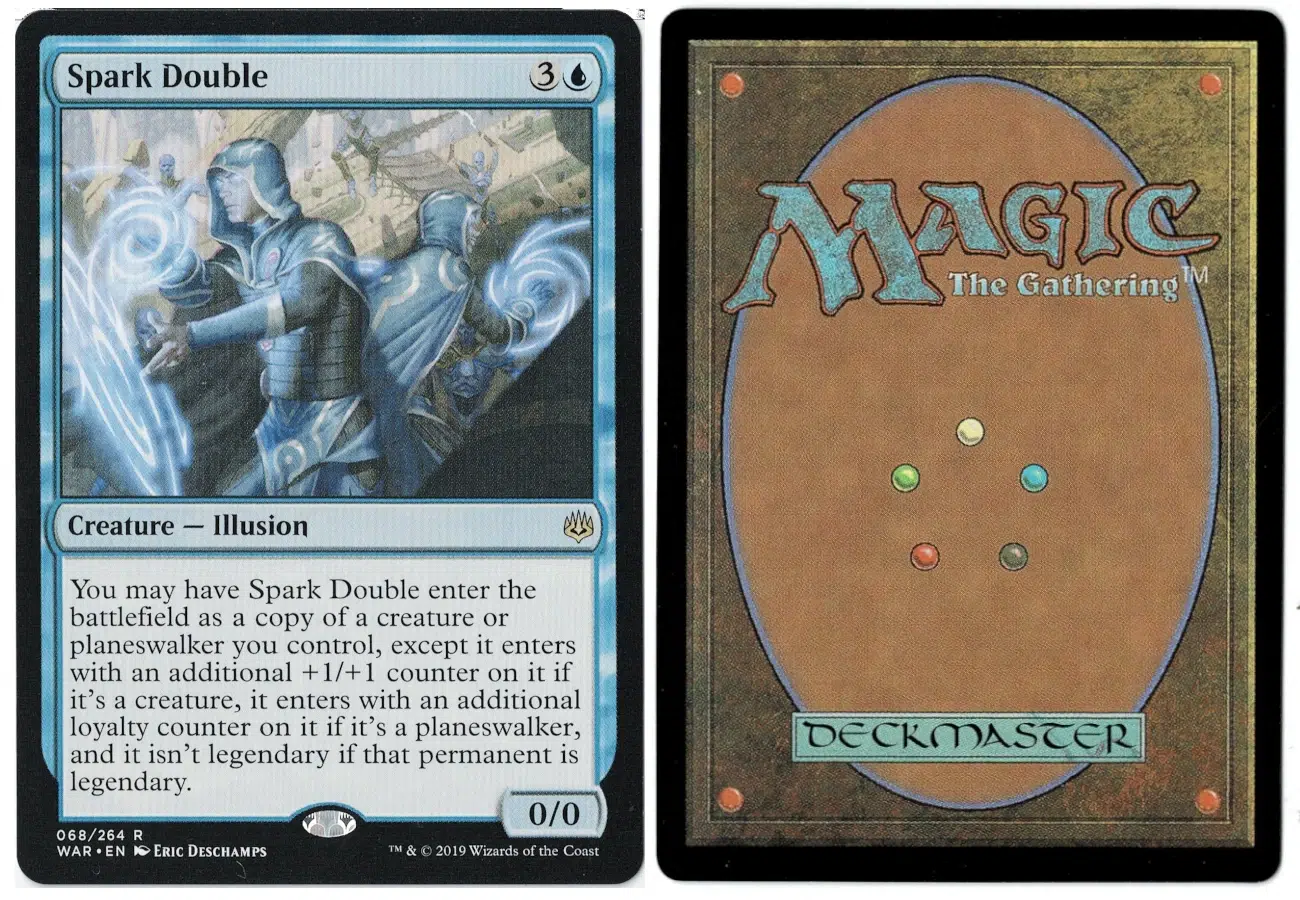 You may have Spark Double enter the battlefield as a copy of a creature or planeswalker you control, except it enters with an additional +1/+1 counter on it if it’s a creature, it enters with an additional loyalty counter on it if it’s a planeswalker, and it isn’t legendary if that permanent is legendary.