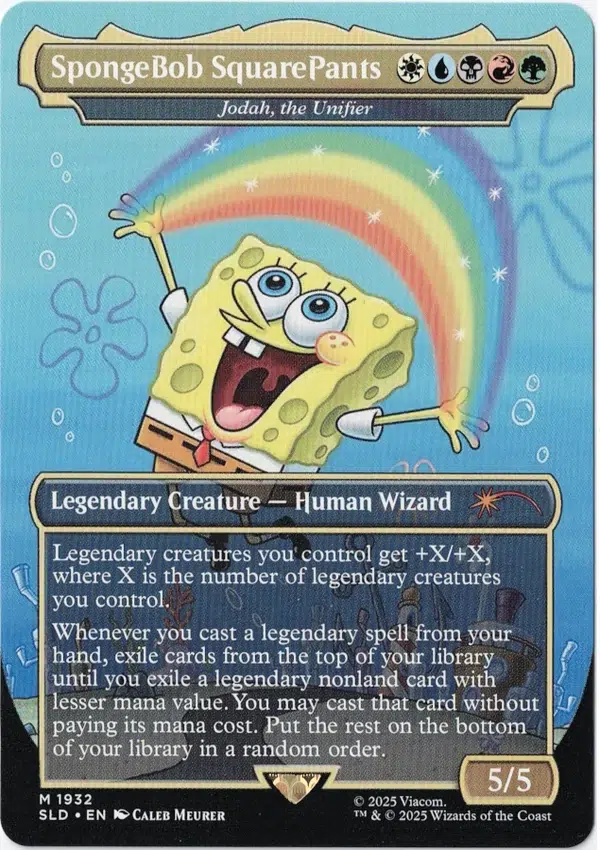 Whenever you cast a legendary spell from your hand, exile cards from the top of your library until you exile a legendary nonland card with lesser mana value. You may cast that card without paying its mana cost. Put the rest on the bottom of your library in a random order.