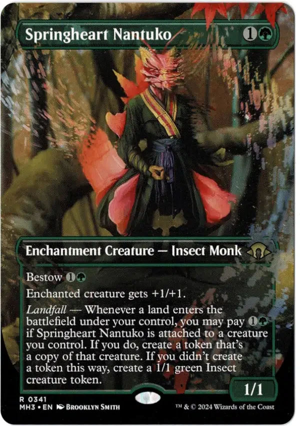 Landfall — Whenever a land enters the battlefield under your control, you may pay 1G if Springheart Nantuko is attached to a creature you control. If you do, create a token that’s a copy of that creature. If you didn’t create a token this way, create a 1/1 green Insect creature token.
