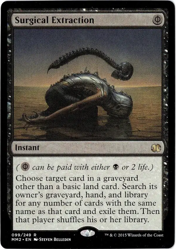 Choose target card in a graveyard other than a basic land card. Search its owner’s graveyard, hand, and library for any number of cards with the same name as that card and exile them. Then that player shuffles his or her library.