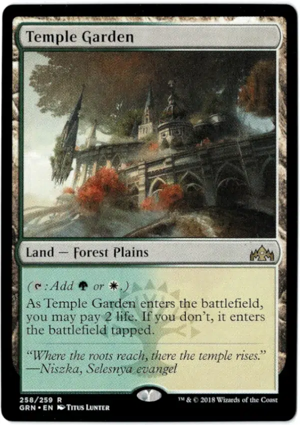 As Temple Garden enters the battlefield, you may pay 2 life. If you don’t, Temple Garden enters the battlefield tapped.