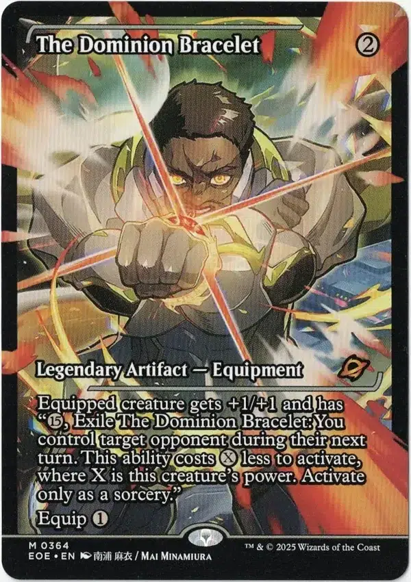 Equipped creature gets +1/+1 and has “15, Exile The Dominion Bracelet: You control target opponent during their next turn. This ability costs X less to activate, where X is this creature’s power. Activate only as a sorcery.”