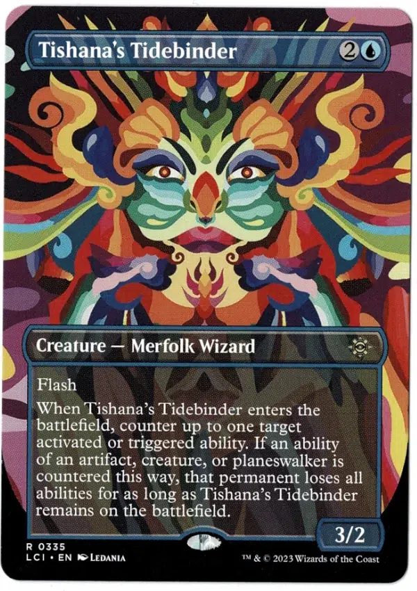 When Tishana’s Tidebinder enters the battlefield, counter up to one target activated or triggered ability. If an ability of an artifact, creature, or planeswalker is countered this way, that permanent loses all abilities for as long as Tishana’s Tidebinder remains on the battlefield. (Mana abilities can’t be targeted.)