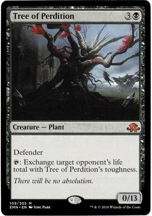 T: Exchange target opponent’s life total with Tree of Perdition’s toughness.