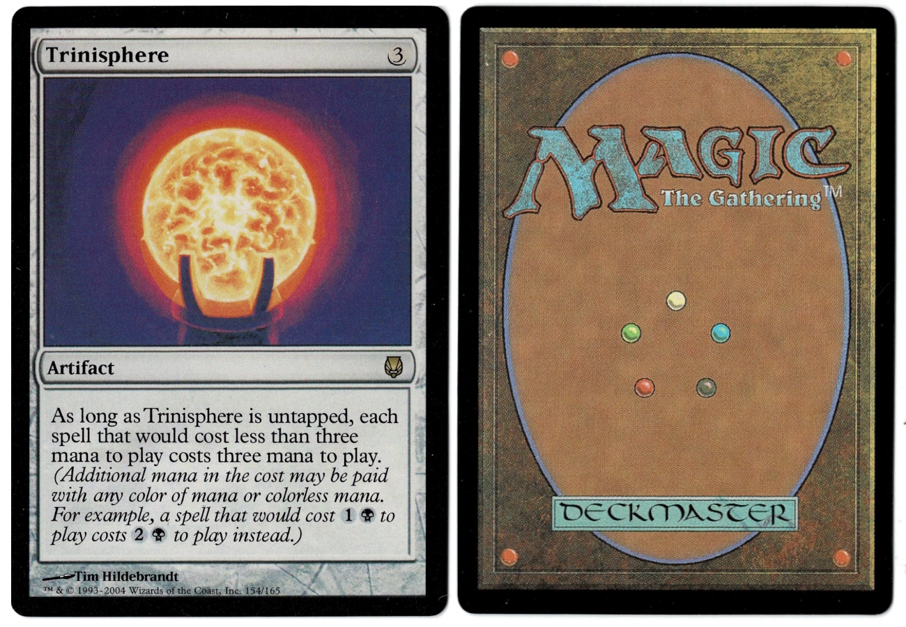 As long as Trinisphere is untapped, each spell that would cost less than three mana to play costs three mana to play. (Additional mana in the cost may be paid with any color of mana or colorless mana. For example, a spell that would cost 1B to play costs 2B to play instead.)