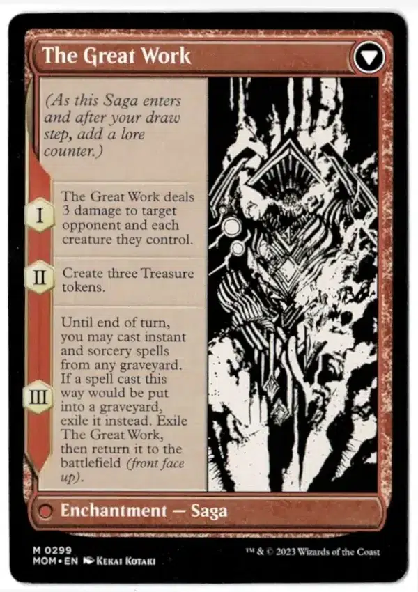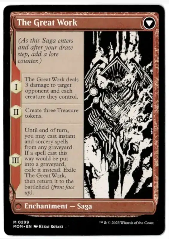 [III] Until end of turn, you may cast instant and sorcery spells from any graveyard. If a spell cast this way would be put into a graveyard, exile it instead. Exile The Great Work, then return it to the battlefield (front face up).
