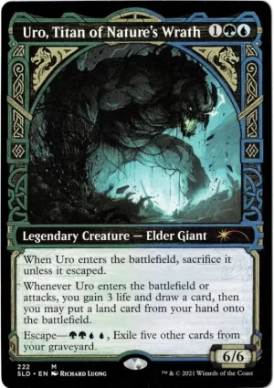Whenever Uro enters the battlefield or attacks, you gain 3 life and draw a card, then you may put a land card from your hand onto the battlefield.