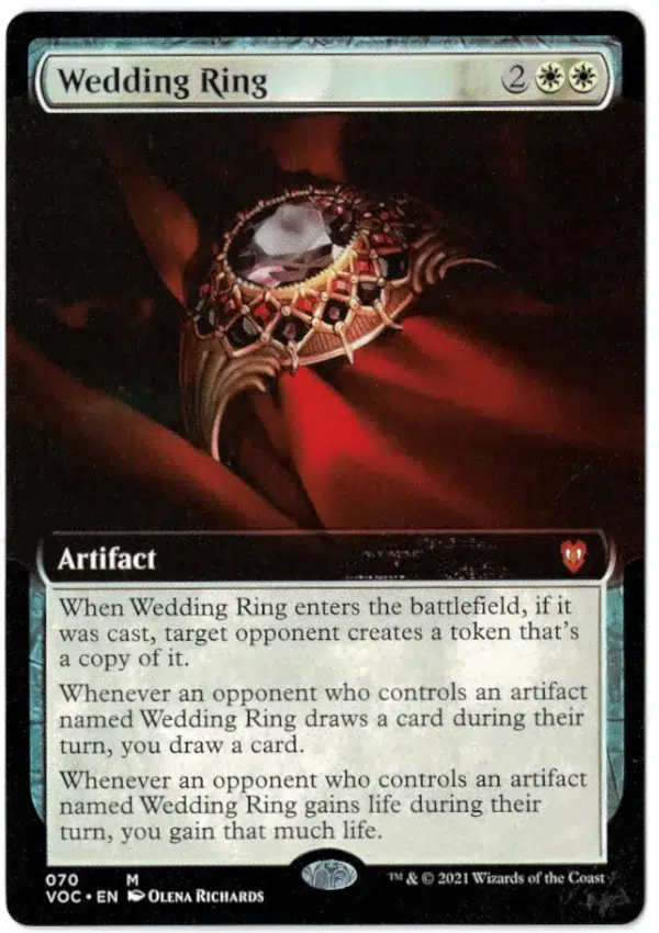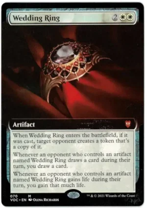 When Wedding Ring enters the battlefield, if it was cast, target opponent creates a token that’s a copy of it.