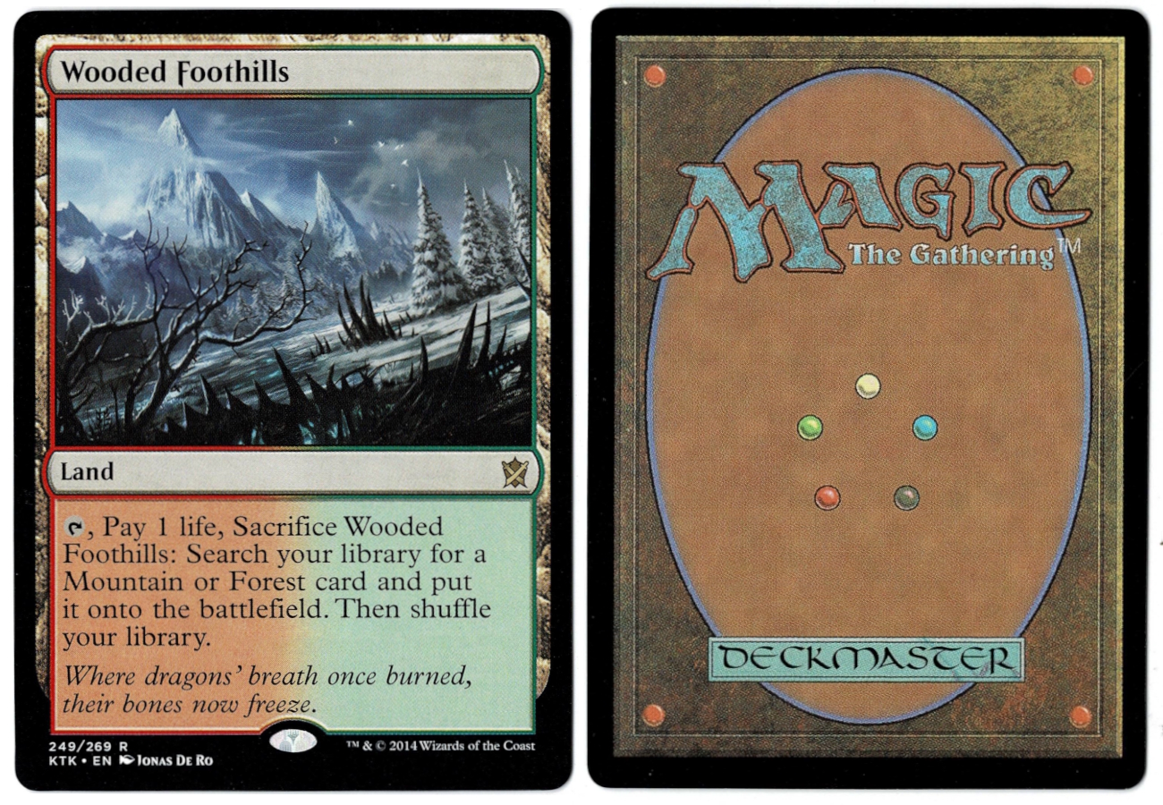 T, Pay 1 life, Sacrifice Wooded Foothills: Search your library for a Mountain or Forest card and put it onto the battlefield. Then shuffle your library.