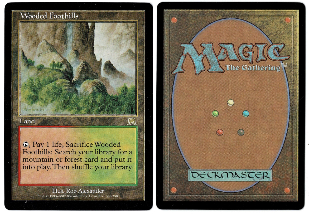 T, Pay 1 life, Sacrifice Wooded Foothills: Search your library for a mountain or forest card and put it into play. Then shuffle your library.