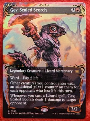 RAISED FOIL Gev, Scaled Scorch (Borderless) from Bloomburrow Magic the Gathering Proxy